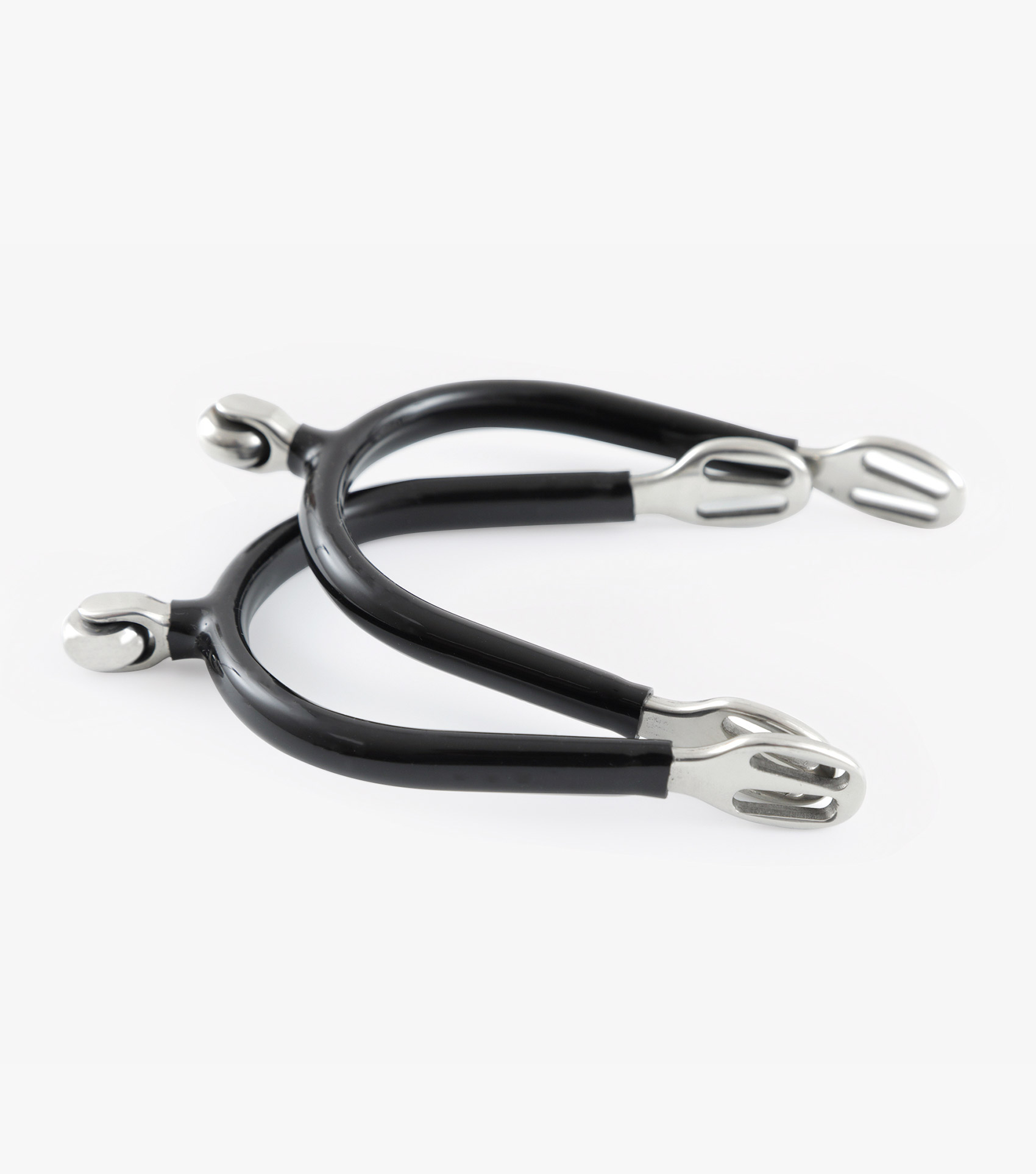 These spurs are rubber covered for a secure contact with the ankle. The free-rolling steel roller balls at the rear can help provide gentle encouragement. Sold in pairs, without straps.