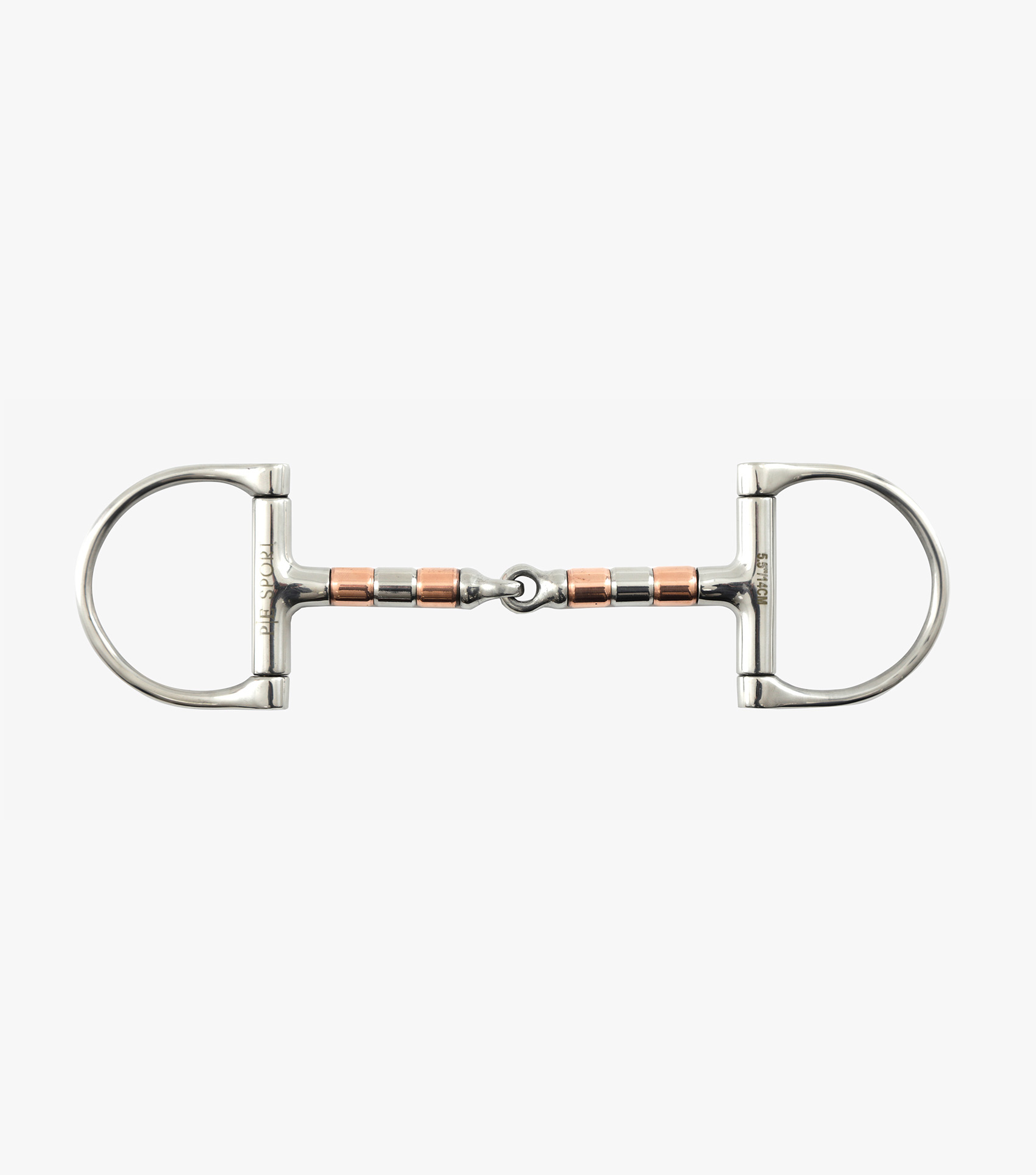 The copper roller mouth dee bit is useful for horses that tend to fix or try and grab/lean on the bit. The alternating copper and stainless steel rollers set along the mouthpiece enable the bit to move in the horse’s mouth preventing them from grabbing or leaning on the bit. The single jointed mouthpiece has a nutcracker action applying pressure on the lips and bars of the mouth. The dee ring cheeks can aid with steering, backing up the aids when the rider asks for a turn.